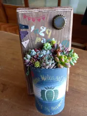 多肉寄せ植え 今回はその名も『多肉パーティー🎉』に行って来ました😊💕✌️リメ缶はいろいろあり、私はこの色をチョイス💙リメ缶と土台に自分でステンシルしましたが、王冠にシートが被りにじんだ😭つまようじもらってちょっと直したけど、え~ん💦悩んでいても仕方ない❗寄せ植え頑張るぞ👊😆🎵盛り盛り🍀盛り盛り🍀隙間探してキュッ💗