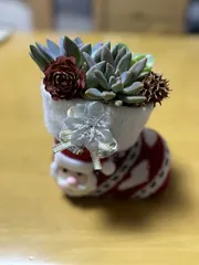 多肉寄せクリスマスバージョンに 寄せ植えします😊 中は深いのでココヤシである程度埋めてから土を少し入れてその上にたっぷりの水苔を敷いて作りました😊クリスマスまでこのまま飾りその後は土に植えます😊きっとその頃には発根していると思うので。それを願って土を少し入れてあります😊 こんなところにもお化粧したシダーローズが