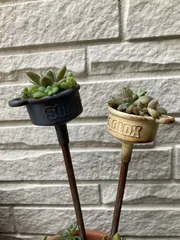 100均のミニじょうごをペイントして、多肉ピックを作ってみました。みなさんの多肉寄せ植えが素晴らしくて、直径4㎝の寄せ植えがメチャハズカシイ💦💦