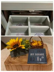 仕切りの部分の端材に今夏の向日葵のドライフラワーをアレンジメントしました。ミニ籠には向日葵の花びらのドライを^ ^ 夏の思い出です♪