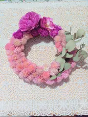 リース お庭で咲いていた千日紅と薔薇、ユーカリをドライにしたものでリースを作りました✨✨
