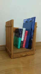 『引出し付きブックスタンド』 もともと、引出しの取っ手は小さな木片のツマミ状のものなのですが、CAINZで別途購入したメタルのハンドルにチェンジ。やっぱりこの方が引き出しやすいし、ちょっとだけ見映えがよく…なったか😁❓ 初めて使ったメープル、軽やかでよい感じです💕