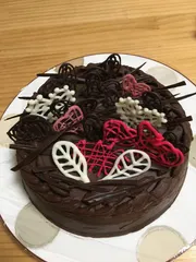 バレンタインケーキ ■作品内容チョコケーキです。■こだわりポイントデコレーションのチョコハートはチョコペンで作りました。中にはリンゴとイチゴが入っています。しっとりのココアのスポンジとリンゴのサクサク、イチゴの酸味で、美味しかったです。