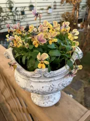 小輪ビオラ〜ビオレッタ 小輪ビオラビオレッタのルーキーズアンティークな花色なので、アンティークな鉢におひとり様で植えました😊