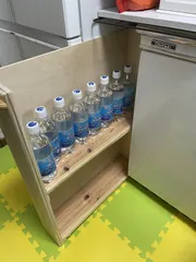 デットスペースにペットボトル収納 お届け編 今日は、義理の妹さんにお届け物をしてきました(^^♪先日作成した隙間収納ラックです。心配していた高さや幅もぴったりでした!!!奥行の長さは少し頭が出るくらいです。設置後の様子今日は仕事の用事があったのでゆっくりとは出来ませんでしたが、喜んでくれてほっとしましたね。今までの様子また、要望があれば作りま
