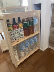 キャスター付き壁風シェルフ♡ 今日は、いつもより時間がかかりました。 下段は、2Lのペットボトルが収納出来るようにしました!