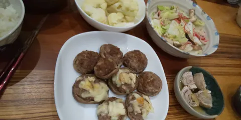 シイタケのひき肉詰め シイタケ栽培は無事に休養状態になったので、たくさんのシイタケを料理するのみ😋 今日はシイタケのひき肉詰め、白菜シイタケの炒め物、シイタケ入り味噌汁とシイタケづくしです。🍄食べきれない分は冷凍します。 巨猫だっ!!😱ライオンさんの話、昼間のバージョン以外にも実はいろいろ