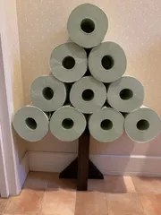 トイレットペーパー ロールホルダー ツリー トイレットペーパーを飾って収納出来ないかと思いつきで即製作🎶アイアン素材を溶接したシンプルな方が好みですが、無理なので廃材利用😆 土台はシンプルに!グリーンのトイレットペーパーなのでツリー形にしました🌲