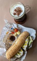 コーヒーに泡立てたミルクと、ココアをのせました。フワフワして美味しいです😋いつものコーヒーも、色々アレンジして楽しんでいます♪ それとチャーシュードッグ🐷チャーシューは煮ておいたので、買ったパンに挟みました🥪