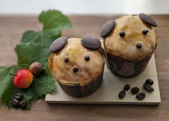 カップケーキを焼いて、コーヒーのアイシングで飾り付け、犬を作りました🐕🤫本当は熊🐻を作ろうと思ったのですが、顔のパーツを付けているうちに、これは犬だ😳となりました。カップの柄は猫🐱です😅 ☝ポイント☕・粉糖に、インスタントコーヒーと水を加えてアイシングを作りました。簡単で可愛く美味しくでき