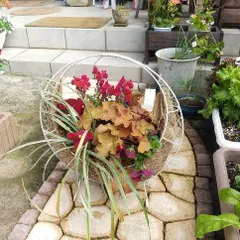 寄せ植え 先日高級花店で寄せ植えセットの花苗グラスは家の鉢から抜いてきた😆とこちらのワイヤープランターを買いました。ヒューケラが主役リバーシブル?(金魚草が主役)冬の寂しいお庭を賑やかにしてくれるかな?