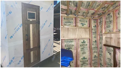 庭にババの趣味小屋作成中![作成途中] 週末しか作業できませんが、ババの趣味の小屋(2畳)を作成中。内壁に断熱材入れたのであとは屋根にアスファルトシングルのせて、窓を2つはめて、床材敷いて、外壁に鎧ばりして…。年内に完了したいけど。完成したらまた公開させて頂きます。