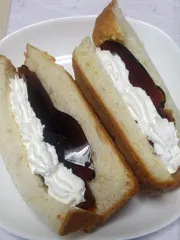 夏のコーヒー時間【コーヒーゼリーパン】 今日は一人だし、外は暑いから、そんな時はパン作り、シンプルに食パン焼いて、冷めたところに、同時進行で作っておいたコーヒーゼリー、パンの切り込みにインして、ホイップクリームを乗っける!具が重いから、パンの耳がついたところを使い、切り込みを入れるだけで切り離さず、サンドではなく、イン、ですね!