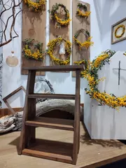ミニ足場風3段ラック作りました☺️何を置くかは考え中 工房のミモザの飾りが可愛いので一緒に💕一番大きなリース