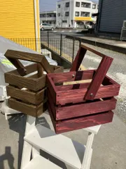 今日(昨日)の作品【持ち運べる収納カゴ】 午前の部午前の部は取手の所のボルトを緩めに留めてみました。午後の部 午後の部の取手は少しボルトをきつめに締めて、取手が立てて止まるようにしました。予約のページの写真だと分かりませんが、『スタッキング』が出来るようになっていました。 色について 茶系は工房にある【ウォルナット】 赤