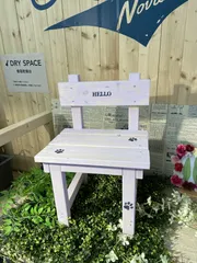 キッズミニチェア完成〜😀✌️🎵 組み立てて、初のライラック色に塗りました、敢えてかすれた感じにアレンジして塗りました〜。helloと犬🐶の足跡を🐾4箇所ステンシルして完成👍✨前後しますが、新教室に置きました❣️姉が新教室移転祝いにモンステラと鉢をプレゼントしてくれたのも一緒に飾ってみました、素敵〜😆✨🎵後ろにも足跡🐾が〜😄🎵 新教