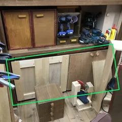 増え続ける工具をなんとか収納しようと、そして扉の裏側に道具を吊るせないかという考えのもと、作った作品になります。 右と左には両開きの扉、中身は板で仕切られています。天板と底板はそれぞれひと連なりの板を使っています。完成した直後から、「不格好だな~、いつの日にか作り直さねば」と思っていました