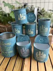 溜め込んだ大量の空き缶をリメイク 先週の土曜日に下地を塗って そこから隙間の時間で本塗りを少しずつ 進めて、全部終わったところで 次の工程、ステンシル! それが終わったら汚し加工 キラキラ加工した物を覗いて 結局全部汚し加工しました 今日で完成です😊完成までもってこれて よかったぁ🤭 1週間かかり