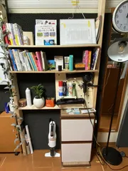本棚兼美容用品収納 し自宅が狭い+鏡とドライヤーを同時に使える場所が限られる為、朝の支度を全部できる場所を作りました。また、置き場に困る文庫本などを収納する場所としても使用しています。現在6畳間の壁一面に棚や収納などを使っており、今回はその一部です。
