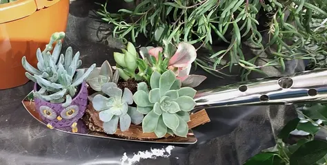 スコップに多肉寄せ植え いろんなバックでパチリ🌺お花がついてた多肉をチョイス。リスさんも興味津々❗️とっても楽しかった😊。多肉用の土にお水まぜて時間置くと、粘りがでて固まる。と初心者にはうってつけのWSでした。