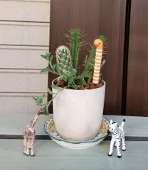 背の高めの多肉とサボテンの鉢に チンアナゴのピックを飾ってみました🎵 このピックはsquare内で紹介されてましたね(セ○ア) 手前には昨日 多肉寄せ植え教室でゲットした きりんさんとシマウマさん おいてみました(チンアナゴと全く関係ないけど😅〉