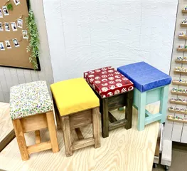 収納付きスツール 以前から気になっていた収納付きスツール。近所の店舗で開催した時に、予定が合わず見送っていましたが、少し離れた店舗でようやく参加できました🎶今回、生地を持ち込みされた方が多く、完成後は色とりどりのスツールが並び、華やかになりました🤩用意して頂いていたデニム模様の生地も素敵でした✨私も生地を持参しました