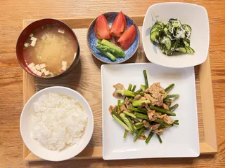 昨日はにんにくの芽と豚こまのスタミナ炒め、シラスのきゅうり酢、茹でアスパラガスとトマト、味噌汁です🤭次の日が仕事お休みなら、安心してニンニクの芽も食べれますね❣️