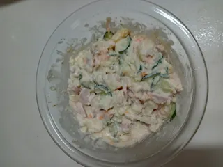 ■材料上記とマヨネーズ■作り方じゃがいもと人参潰す。きゅうりと魚肉ソーセージ混ぜる。玉ねぎの汁気を絞る。肉も細かくして混ぜる■工夫ポイント①ポトフなのでしおけがあるので、マヨネーズだけで味は抜群。 ②耐熱ボールで作ると食卓にそのまま出せるので洗い物が減る… はい出来上がり…