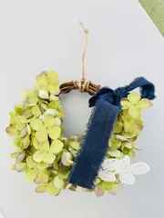アジサイのリース フラワーピクニックで午後からのWSに参加して作りました。 事前申込制で、その時は分からなかったのですが、アジサイは造花でした。勝手にドライフラワーと思い込んでいたので、ちょっと残念でしたが、500円と破格なので、よく考えたら分かることでした。 なかなか良い感じに仕上がりました。