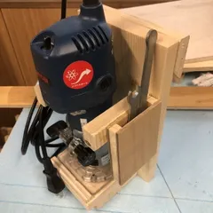 トリマー置き台 トリマーを置く台を作りました。ツールキャビネット(大型)の奥へ引っ掛けて吊るすことができます。当初は、下の写真のような構造でした。ところが、ビットを交換するときに使うスパナが別のところにあると、探したり持ってくるのが手間なので、一緒に収納するためのケースを作りました。というわけで、全部端材で作ってあ