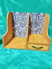 レトロなブックスタンド ワークショップでつくってきました。シートが黒柄なのでパイン色でぬりました。引き出しもうまくいきました。