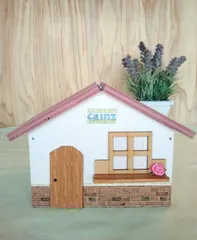 優しいピンク色の屋根を初め、装飾もとっても可愛らしいお家ですね❣️ ステンシルの文字もお洒落ですね✨