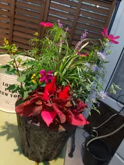 コスモスの寄せ植え こんなお花が用意されています。この後、ポットに入っている苗の土を落としたり、様々な作業がありました。が、写真を撮る余裕がなく、あっという間に完成です。フクロウが仲間入りしてくれていましたよ。今回ご一緒した方たちと和やかにお話しながらのWS、とても楽しかったです。ありがとうございました。