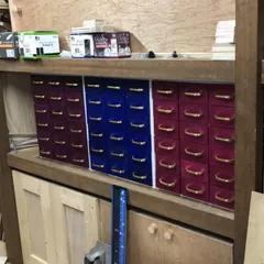 ネジ、ボルト、ナット、丁番などを収納する目的で作っていたパーツキャビネットです。3列✕6段編成で、金属の取っ手が付いています。並べてみると、壮観なんですが……木粉にまみれることを思うと、作業場にはオーバースペックだと判断し、撤去することに……。( ゚д゚)ガーン! 実は奥にもあったりして