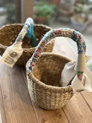 NEW カゴ屋さんのワークショップ ロハスフェスタ東京でカゴ屋さんのワークショップで作りました。 たくさんの大きさ、形のカゴから好きなのを選んで取手の部分に好きな布を巻き巻き青系の布を選びましためちゃくちゃかわいいカゴになりました。ショップの刺繍札もとってもかわいい 他の形も作りたくなって帰り際にもう1個作りました