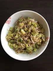 大根の茎を炒めたやつ ってずっと家族間では呼んでるからいざタイトルとなるとなんだろう?と悩みました。ふりかけみたいなお茶請けみたいな…🤔 材料です ⚪︎大根の茎(私は葉っぱ部分は取っちゃいます)⚪︎しらす⚪︎かつお節 全部適量ですが1:1:1くらいの割合で入れてる事が多いです。量が違っても大