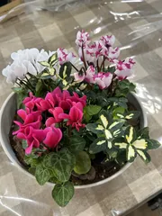 みなと店のレンタルスペースにて寄せ植え②①に続いてガーデンシクラメンを色違いで3個カラーリーフ ツルマサキサンスポットを1個シクラメンは球根の頭?が見えるところまで土を除いて仕上がり線より上↑に植えます🪴講習のとき記憶を頼りに😊🤲🍀前回植えた赤色とは違うけど🪴これもまた可愛い仕上がりに🩷自己満足です