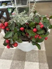みなと店のレンタルスペースにてお花を買って自分で寄せ植え💕🎶チェッカーベリー2個とカラーリーフのコプロスマキルキーで実が長持ちのチェッカーベリー🛑と書いてありましたが、寄せ植え中に2.3個落下💦💦赤色❤️が映える可愛い😍仕上がり🎶🎶3個植えただけです。。。。。