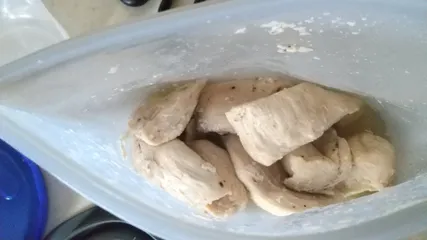 シリコンスチーマで蒸し鶏🐔 火が通りやすいように削ぎ切り■材料鶏胸肉、砂糖、塩、料理酒砂糖はお肉に水分を閉じ込めてくれるそうです塩、料理酒も入れて15分ほど漬けておく■作り方胸肉を削ぎ切りして砂糖を揉み込むスチーマに入れて塩と料理酒を入れレンジで加熱(レンジによって加熱時間は違うのでご自宅のレンジ調整でお願いします)