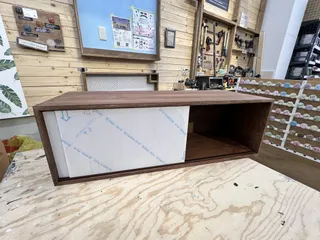 高さ自由ラック 蜜蝋仕立て WSで高さ自由ラックを作成しました😆木目を生かしたかったので、背板はウォルナット塗装、家で背板以外を蜜蝋で塗装しました👍WS直後。側面内側は未塗装です。この作品はラックとしてではなく、以前作成したキッチン収納棚(食品入れにしていません💦)に入れるボックスとして使うつもりでした。収納棚は納戸に置いてま