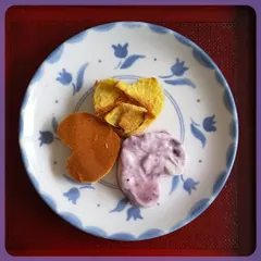 NEW ギリシャヨーグルト(ブルーベリー)&🍠ケーキ🥮 🍠をトッピングしたヨーグルトケーキをネットで見つけたので、水切り不要のギリシャヨーグルト(ブルーベリー味)に変えて、オーブンで焼きました。①🍠60gを3㎜にスライスしラップで挟み、電子レンジに3分かける②ボールに卵1個を泡立て、砂糖大さじ2をすり混ぜ、小麦粉50g→ギリシャヨーグルト60g→サラ