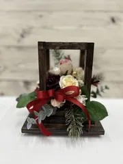 シルクフラワーで作るクリスマススタンド 最初にスタンド枠をボンドをつけて組み立てますが、ボンドだけだから慎重に👀💦お花はドーム型のオアシスにワイヤリングしながら刺して作ります。簡単なレイアウトをしてから作りましたが出来上がりは参加者の方々それぞれに素敵でした。家で飾ればオンリーワン🐶参加者の方の作品と一緒に記念撮影🍀