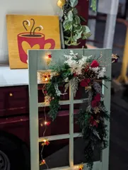 ■作品内容丸じゃないけど、クリスマスリース作りました😊WSで作ったアンティークドアとサインボードと共に💚💛イベントで飾らせていただきました✨ ■工夫ポイントドアにも映えるような、夜になりライトをつけたら更に綺麗に見えるような色使いでリースを飾り付けました🎄 その後、お庭からの玄関