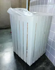ゴミ箱(ミニサインボードを使って) 里帰り出産の娘は明日自分達の家に帰ります。赤ちゃんの使用済みのオムツをビール袋に入れてフローリング(ベビーベットの側)に置いた状態でいるので専用のゴミ箱を作りました。(檜:内寸14✖️25✖️h26㎝)蓋部分を少し手間に出す事で、取っ手なしでシンプルに仕上げました。明日以降使って頂こうと思います。