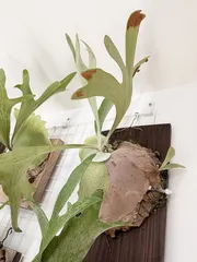 立派な株ですね。 貯水葉が浮いているようですが、水苔を巻くときに沿わせて巻くといいですよ。 名前の通り、枯れてからが本来の役割のお水を貯める葉となります。 貯水葉ターンが来ると、左右に展開してグリーンの貯水葉が綺麗なんですけど、2ヶ月くらいで茶色くなります 私はほとんど全てのビカクシダは室内です