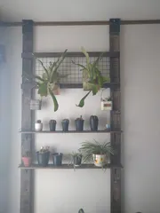 一昨年GWSで出会ったビカクシダ、株分け後も元気に成長しています☺️ビカクシダのために作った棚ですが、出窓に置ききれない鉢たちもここに置いています。陽当たりが良いので居心地良さそうです✨足元にロングベンチか足場風3段ラックを置きたいので、棚の下は大きく空けています。早く作りたいなー☺️