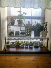 ①ジグソーでホールソーの水換えがなかに瓶を入れてとあったので、ゼリーの容器とペットボトルのキッタやモノを合わせてアボガドのめをふやそうとおもい、食べて水栽培はじめました。②苔も元気に育っています。ガラスに張って伸びてきている…