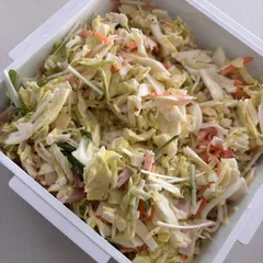 コールスロー キャベツ半分粗い千切りで使って作りました。グリーンは水菜、ハム、人参、カニカマ、お試しで😁らっきょ2個追加。キャベツが甘くて美味しくできました。
