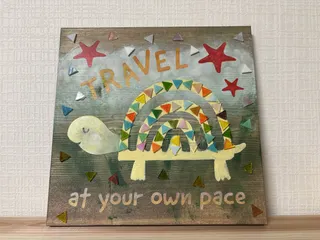 B&bミニサインボード(➕アレンジ😅) 《旅するカメ》とっても可愛いデザインなんですが作成前にGoogleで検索したらシロツメグサの様な白い花が咲いている草原を歩いているミドリガメの映像が出てきて、そんなイメージで作りましょう〜って思ったのが間違いでした😅色選びが上手くいかなかったのか病気のカメが歩いている感じになってしまいました。私、迷