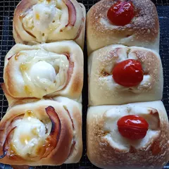 今日のパン ハムロールが食べたくて、昨日買ったウズラ卵をトッピング、右はカマンベールチーズを中に一ピース、上にミニトマトをトッピング、ハーブソルトをぱらり、母に頼まれたので持って行きます。